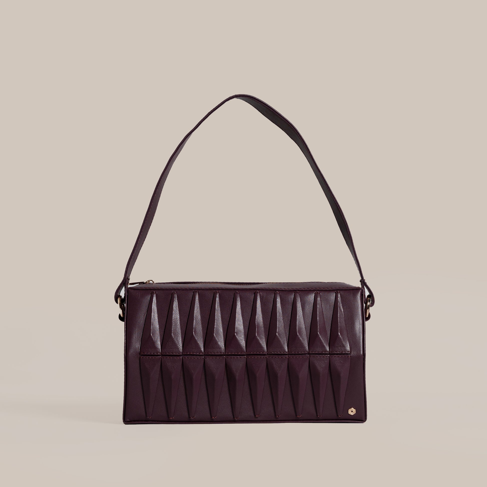 Crafted with a multiple layered structure to give it a perfect geometric form. Finished with matte goat skin leather detailed with 40 faceted triangles, each assembled and perfectly placed by hand. Suitable for all occasions. The bag has plenty of space for all your essentials. It can be carried on shoulder or swung by on the arm.