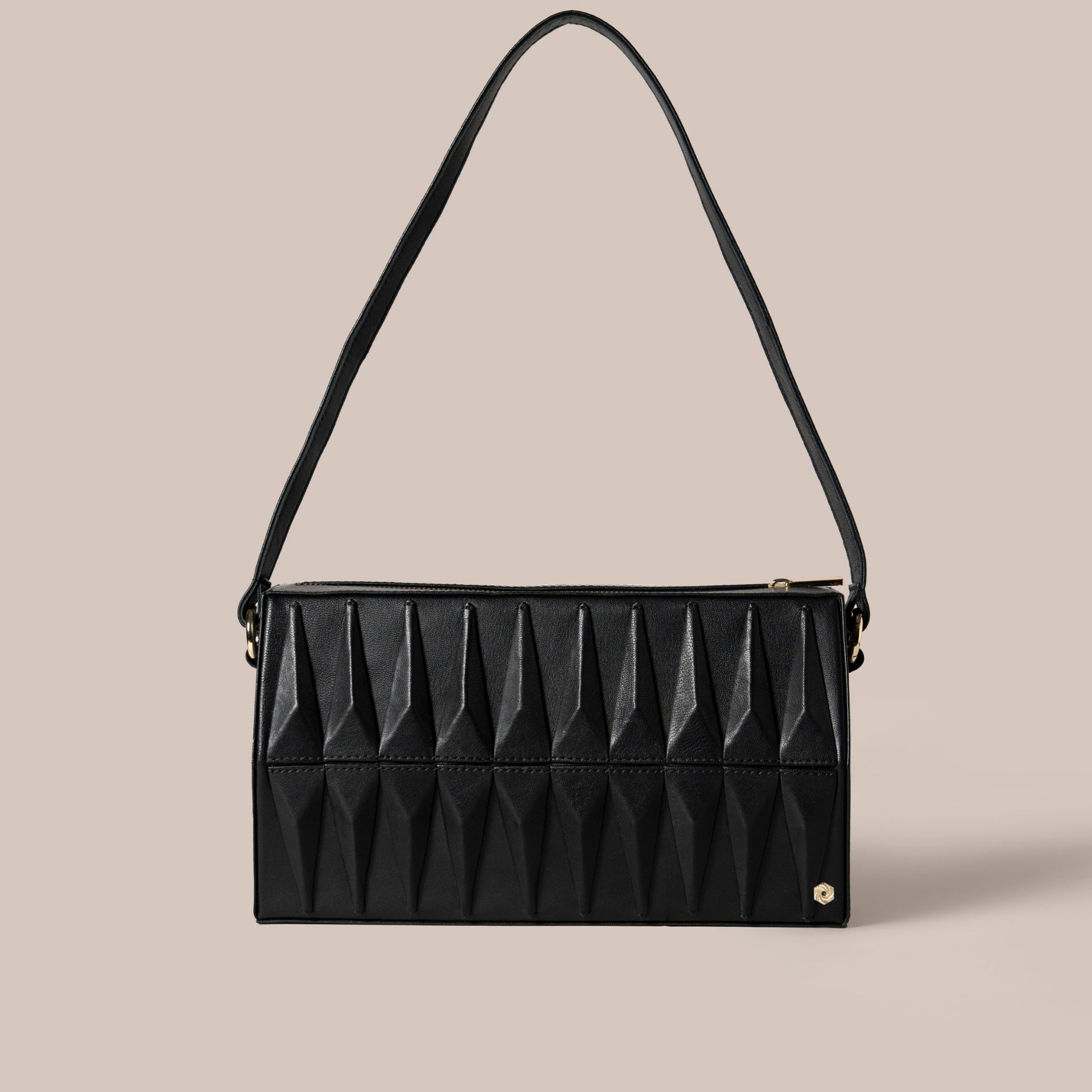 Crafted from luxurious matte goat skin leather, this bag features signature Warp faceted triangles and refined metallic hardware. Each triangle is meticulously handcrafted for precision. Spacious and practical, it offers ample room for your essentials, while the sleek flat handle rests comfortably on the shoulder.