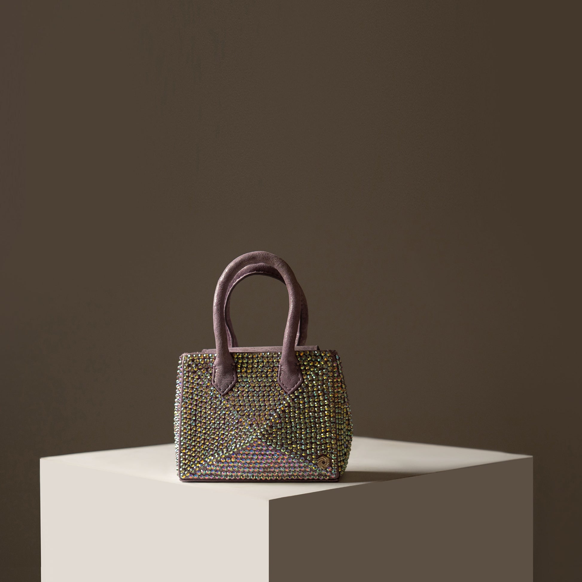 Hexella Petit Lavender a perfect statement accessory for this festive season. Crafted from beautiful prismatic foil hot stamped on lavender suede with twinkling crystal embellishment. Just big enough to carry your party essentials.