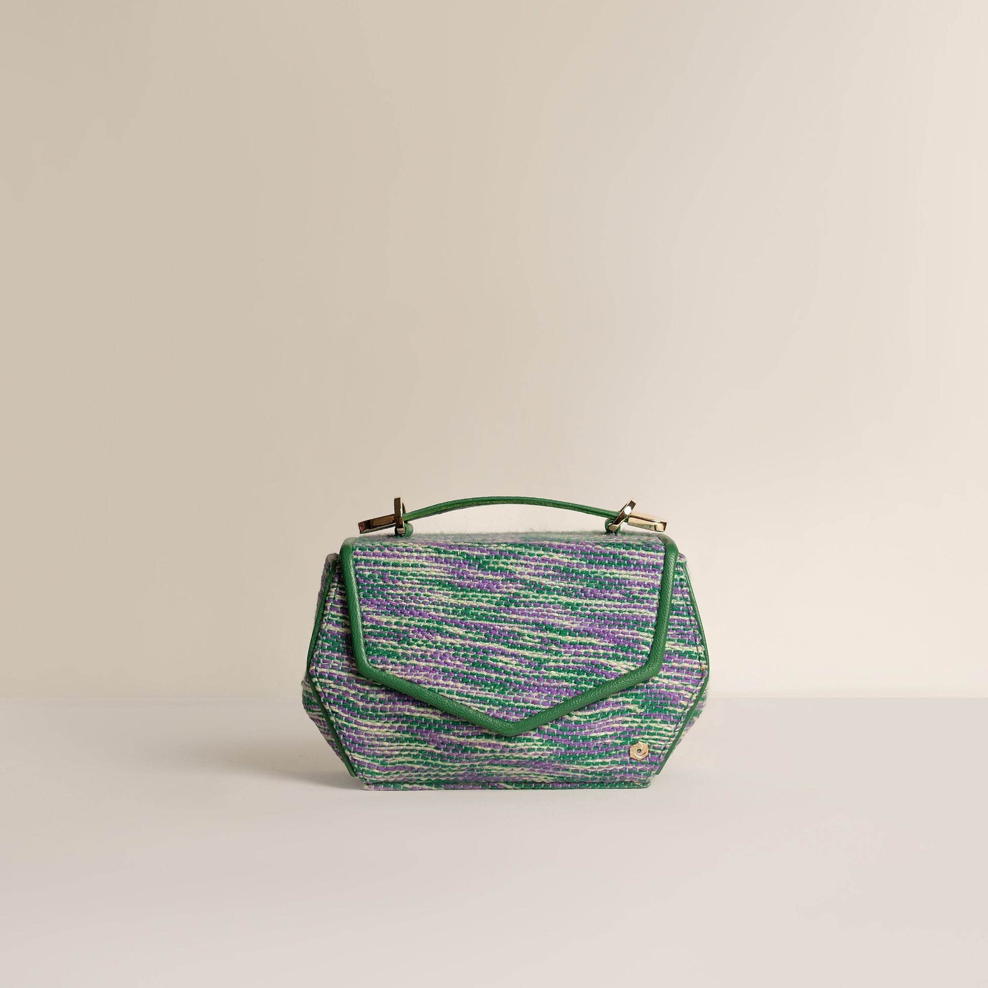 The Matcha Zen Woven Clutch brings a softer, more serene mood to our High Summer collection. Handwoven in calming tones of lilac, green, and white, it’s a playful yet balanced piece that adds charm to any look. The texture is smooth to the touch, with a gentle structure that feels easy to carry. It features a green leather top handle with gold hardware, and a long strap for shoulder wear. Inside, a small slip pocket offers space for your essentials.
