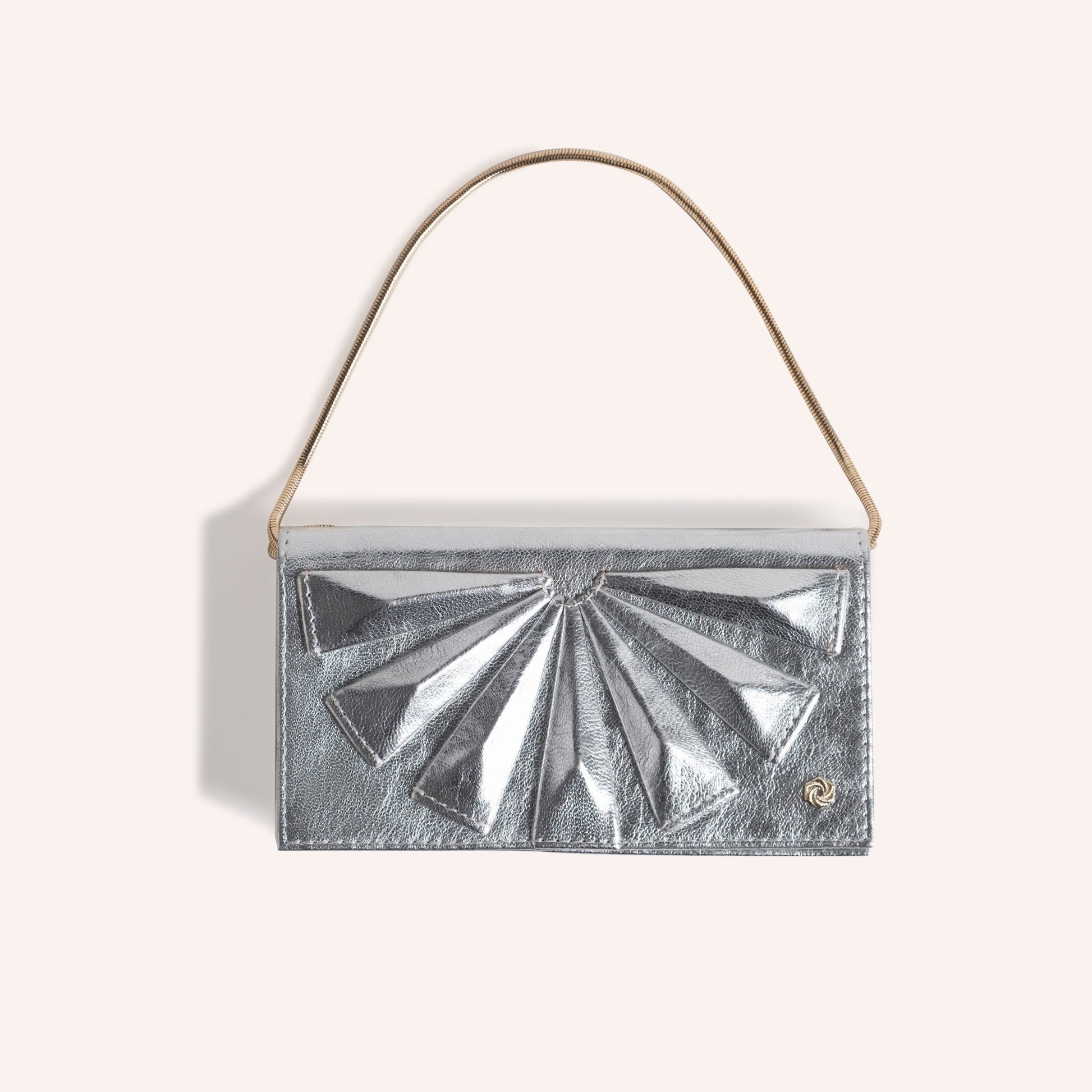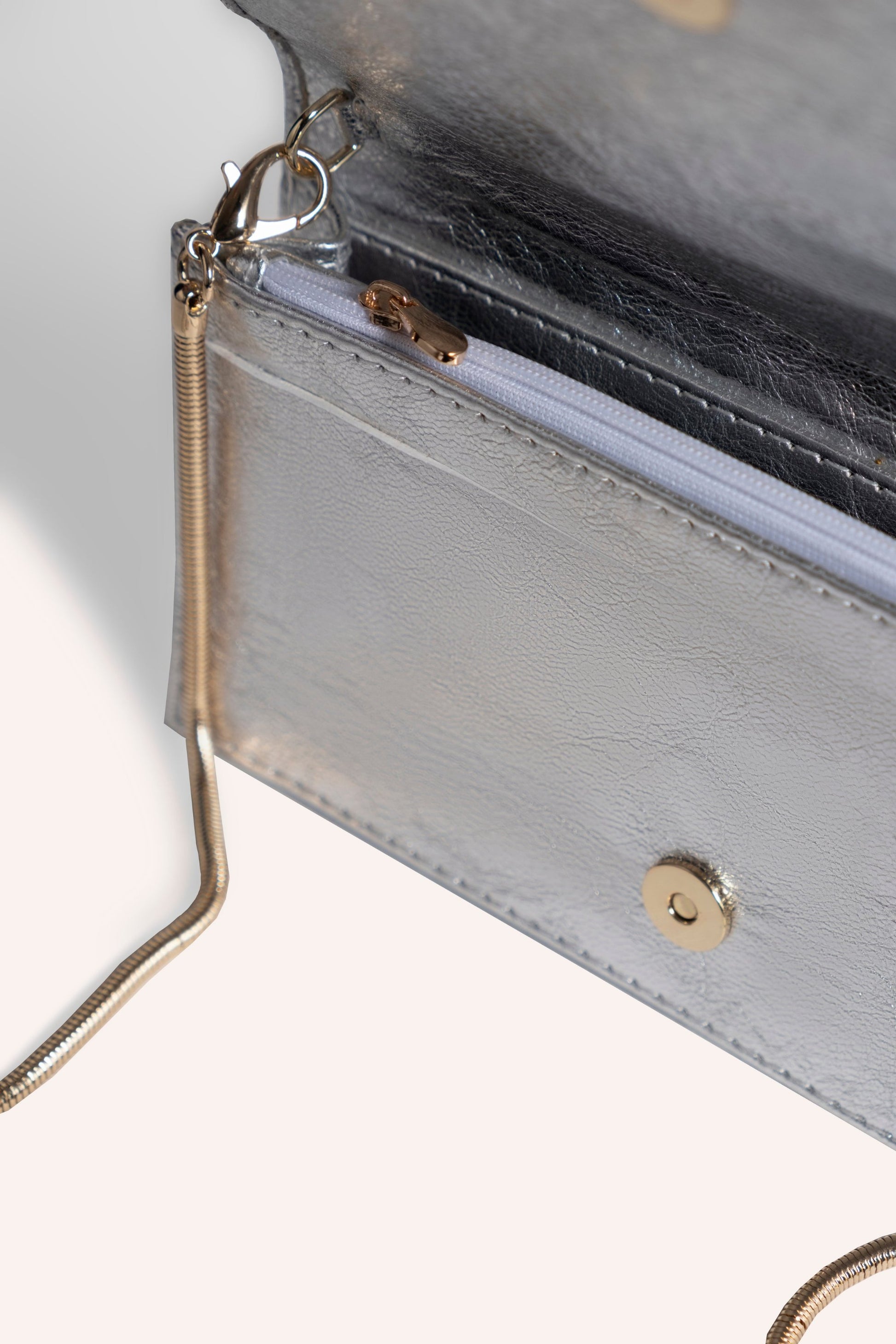 Elevate your evening look with this stunning silver wallet on chain. Crafted from hammered silver-textured goat skin leather with hot foil stamping, it features a detachable shiny gold metal chain for versatile styling. Carry it as a chic clutch or a wallet on chain, perfect for weddings, festive celebrations, or night events. With card slots, a zip closure, and space for your mobile phone, it combines elegance and practicality in one sophisticated piece.