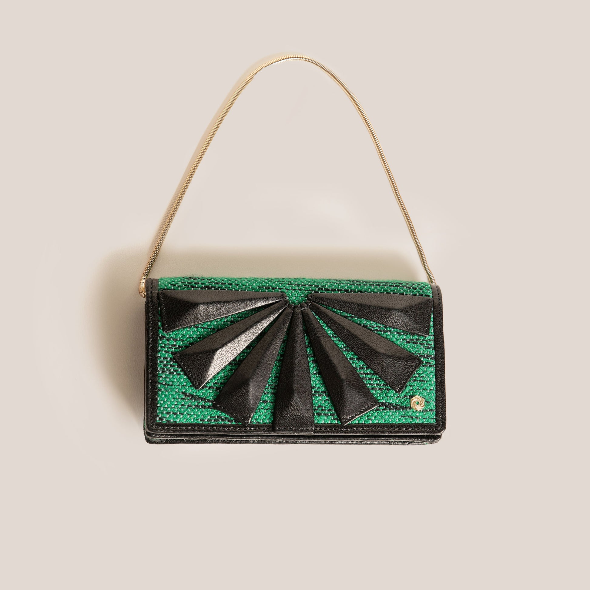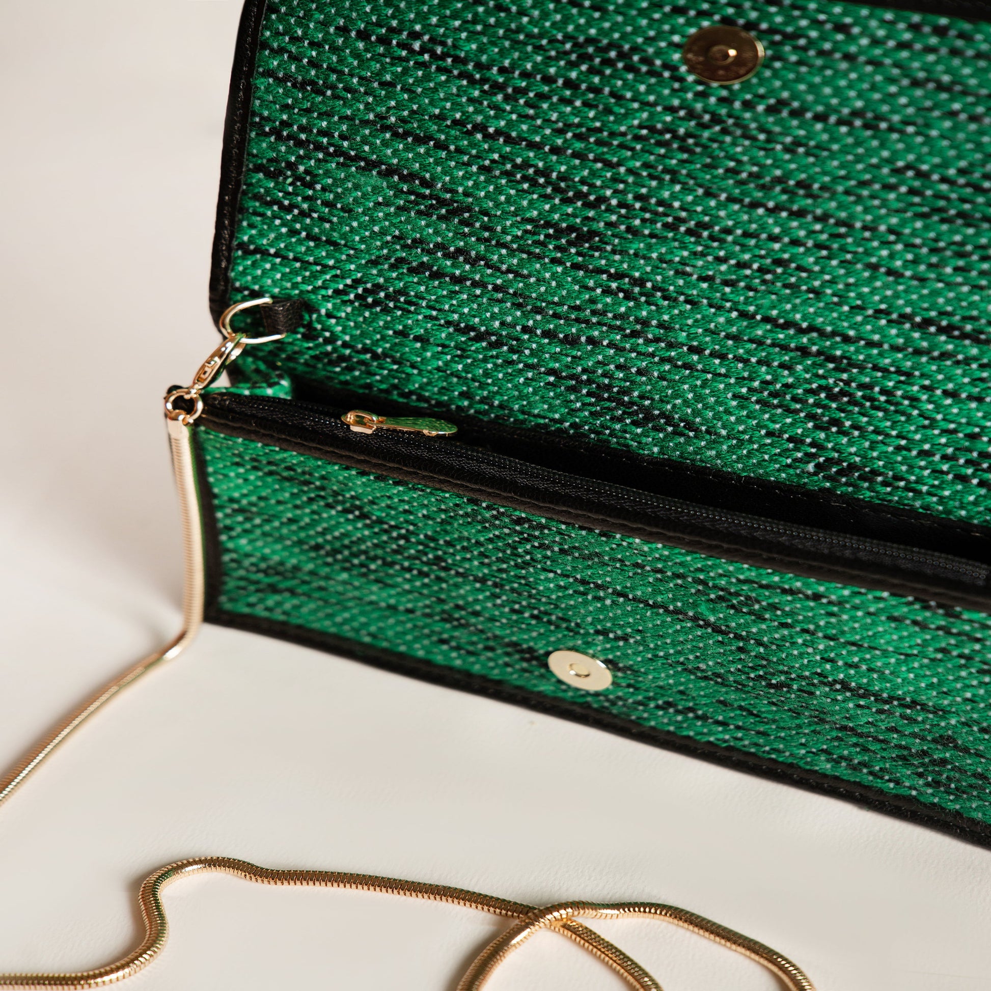 A sleek standout from our High Summer collection, the Ivy Mirage Woven Wallet-on-Chain is crafted from handwoven fabric in bold black and dark green, with subtle hints of white. Designed to carry just what you need, it can be used as a wallet or worn cross body with its detachable gold chain. Inside, a zip pocket keeps valuables secure, while a slip pocket on the back adds convenience.